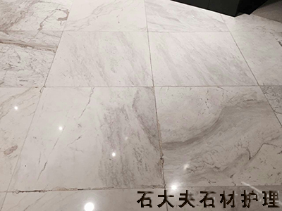 真北店建造于2008年,為了盡顯“高貴”、“典雅”的店面風貌,1號門大廳地面石材在設計時采用了800x800的大規格天然爵士白。由于在鋪裝時的不專業留下了很多“空鼓”的遺憾。因爵士白板材強度非常低,導致在使用時,形成多處斷裂、缺邊、掉角,日積月累下來,可謂千瘡百孔。而爵士白由于其主要成分為硫酸鎂,表現為“白而透”,之前我們也曾嘗試過去維修,但破損維修處的光度和色相都無法與大板相融合;再加上爵士白的主要成分為硫酸鎂,采用傳統酸蝕拋光很難達到設計的想象效果,雖然之前也有進行日常保養,但均不盡意
