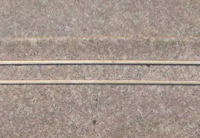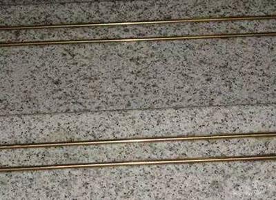如果銅條鑲嵌時,凸出石材表面比較多,則不能直接研磨,否則磨片容易打飛。遇到這種情況,和處理石材較大的高低差原理一樣,即用云石膠將落差處填補起來之后,再進行研磨。